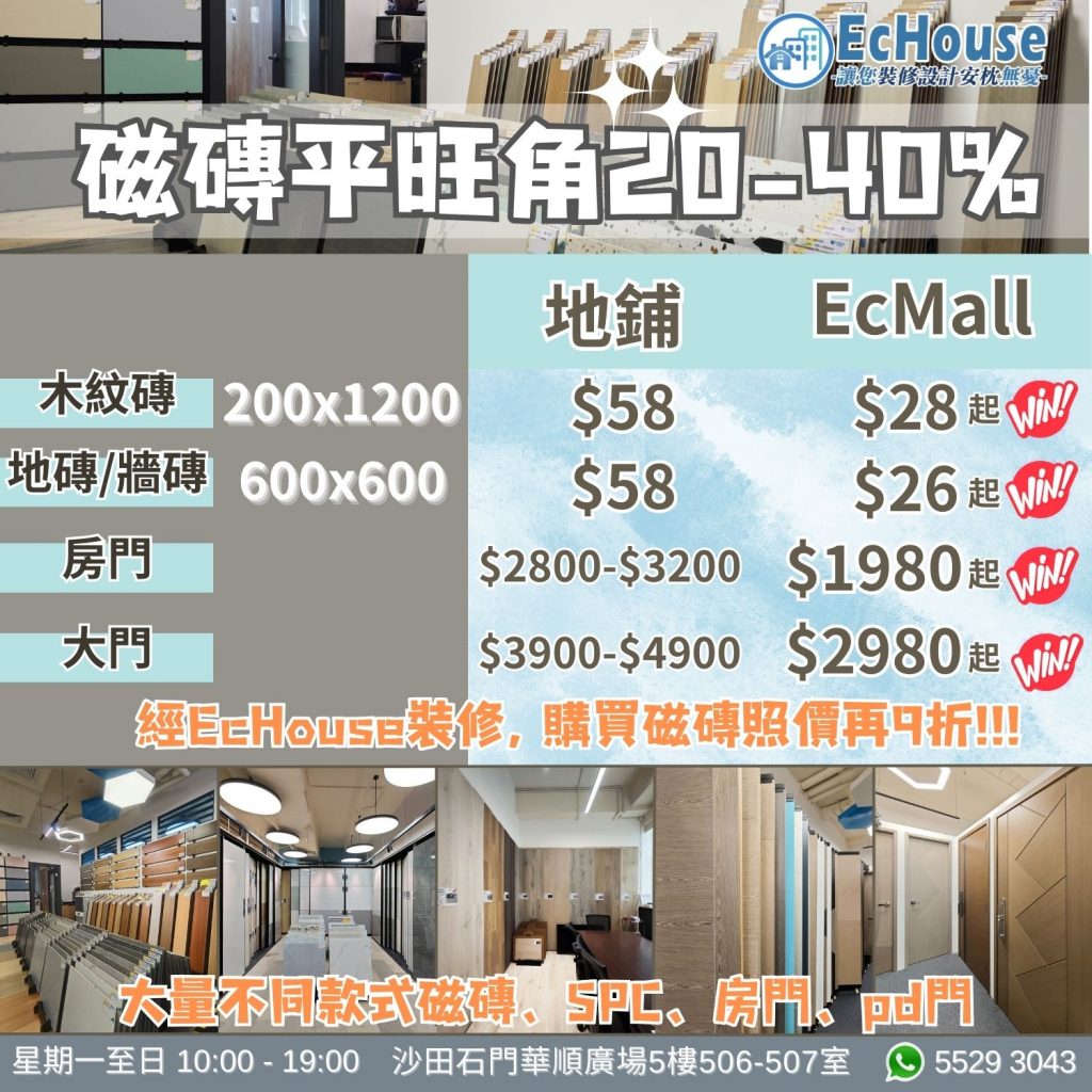 EcHouse Mall提供高品質的瓷磚和木紋磚,價格比旺角地鋪市價低20-40%。我們的瓷磚都是優等級/AAA級,厚度為10毫米,擁有超過1,000款瓷磚可供選擇,包括地磚、牆磚、木紋磚和六角磚。